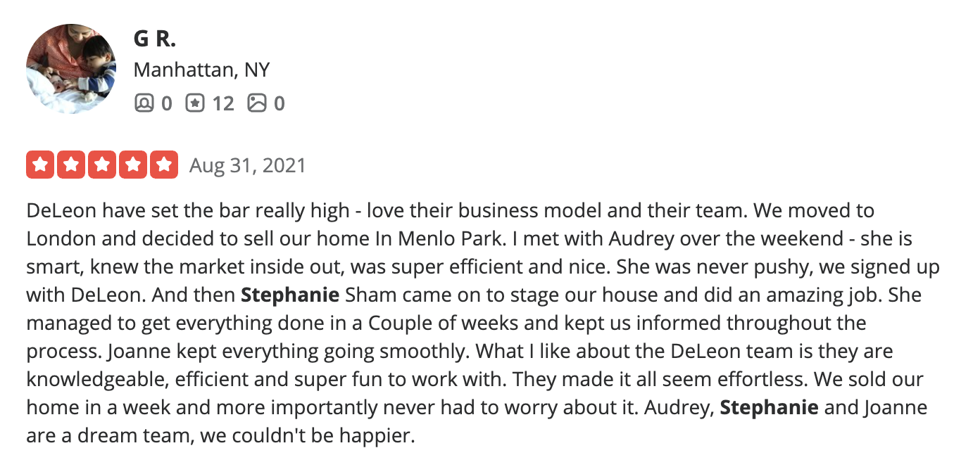 Here are some reviews from the happy clients I helped during my time as a Design Coordinator/Project Manager for DeLeon Realty, a luxury real-estate firm in Silicon Valley, California.